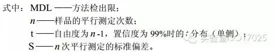 按照樣品分析的全部步驟,對(duì)濃度值或含量為估計(jì)方法檢出限值2~5倍的樣品進(jìn)行(≥7)次平行測(cè)定。計(jì)算次平行測(cè)定的標(biāo)準(zhǔn)偏差,按公式(A.2)和公式(A.3)計(jì)算方法檢出限。MDL值計(jì)算出來(lái)后,需判斷其合理性。