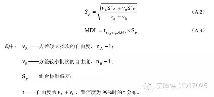 對(duì)于針對(duì)單一組分的分析方法,如果樣品濃度超過(guò)計(jì)算出的方法檢出限10倍,或者樣品濃度低于計(jì)算出的方法檢出限,則都需要調(diào)整樣品濃度重新進(jìn)行測(cè)定。在進(jìn)行重新測(cè)定后,將前一批測(cè)定的方差(即S2)與本批測(cè)定的方差相比較,較大者記為Sa2,較小者計(jì)為為Sb2若Sa2/ Sb2>3.05,則將本批測(cè)定的方差標(biāo)記為前一批測(cè)定的方差,再次調(diào)整樣品濃度重新測(cè)定。若Sa2/ Sb2<3.05,則按下列公式計(jì)算方法檢出限:
