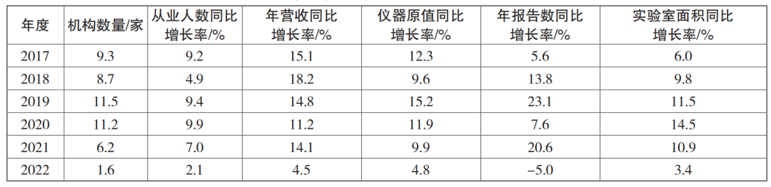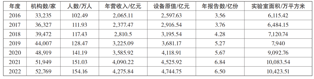 本文收集整理了2016—2022年度國(guó)家市場(chǎng)監(jiān)督管理總局發(fā)布的檢驗(yàn)檢測(cè)服務(wù)業(yè)統(tǒng)計(jì)簡(jiǎn)報(bào)數(shù)據(jù),如表1和表2所示,近年來(lái)我國(guó)檢驗(yàn)檢測(cè)行業(yè)除2022年報(bào)告數(shù)同比下降5.0%外,在機(jī)構(gòu)數(shù)量、從業(yè)人數(shù)、年?duì)I收、儀器設(shè)備資產(chǎn)原值、實(shí)驗(yàn)室面積等指標(biāo)上均實(shí)現(xiàn)了逐年增長(zhǎng),表明我國(guó)檢驗(yàn)檢測(cè)行業(yè)整體仍處于成長(zhǎng)期,吸引了大量資本入局。但2022年度各項(xiàng)指標(biāo)增速均明顯放緩,反映了行業(yè)已告別野蠻擴(kuò)張期,迎來(lái)發(fā)展拐點(diǎn),市場(chǎng)競(jìng)爭(zhēng)加劇、投資熱情下降,淘汰洗牌和轉(zhuǎn)型升級(jí)將成為行業(yè)后續(xù)主旋律。