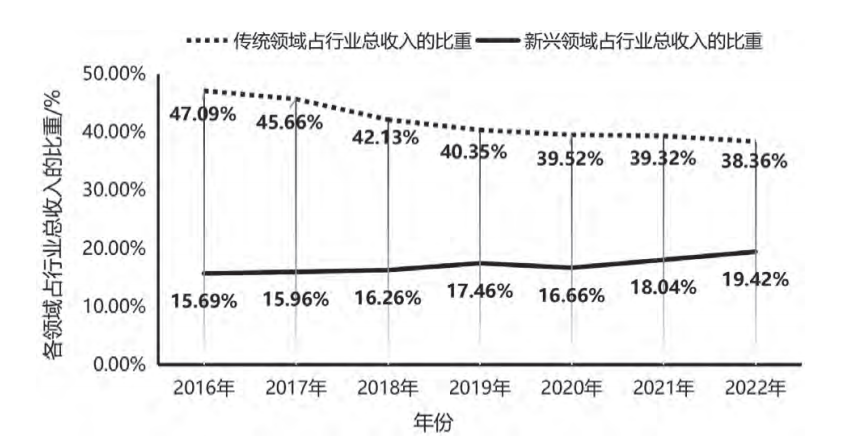 圖1 2016—2022年新興領(lǐng)域和傳統(tǒng)領(lǐng)域行業(yè)營(yíng)收占比情況